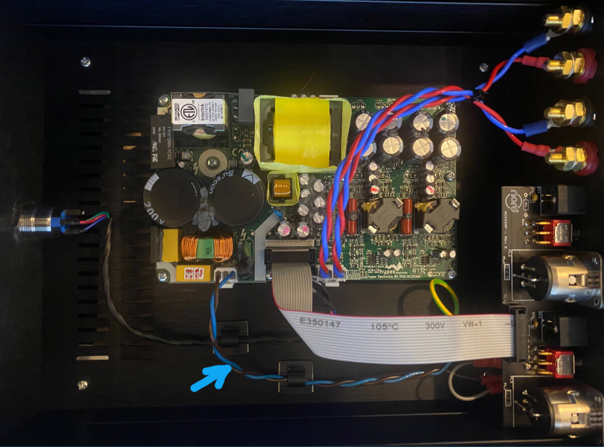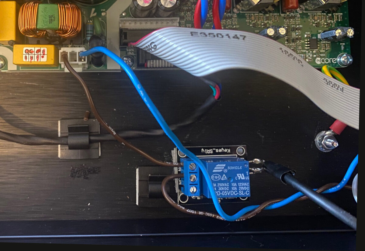After disconnecting the power plug from the amplifier main board it was simply a matter of untwisting it and cutting the +ve (brown) wire. Stripped the ends and connected up to the Normally Open and Common terminals on the relay board. The switch is now normally open but when a 5 volt supply is applied to the other side via the CXN USB outlet, the switch closes completing the circuit and the amp switches on! Of course, I have to leave the amp rear and front power switches in the on position. Then it’s just a matter of sticking the relay somewhere where it isn’t going to interfere with anything else. I used a bit of Velcro tape to stick it down as seen below. This particular module has a red LED that lghts up when the switch is active which gives a reassuring glow through the top amp vents.