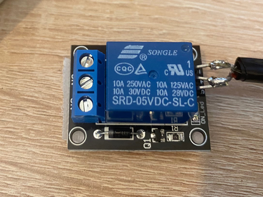 This relay is fitted to a PCB and has a -ve, a +ve and a signal (s) terminal on the 5 volt side. I connected the positive wire to +ve and S terminal together as I won’t have a separate signal.
